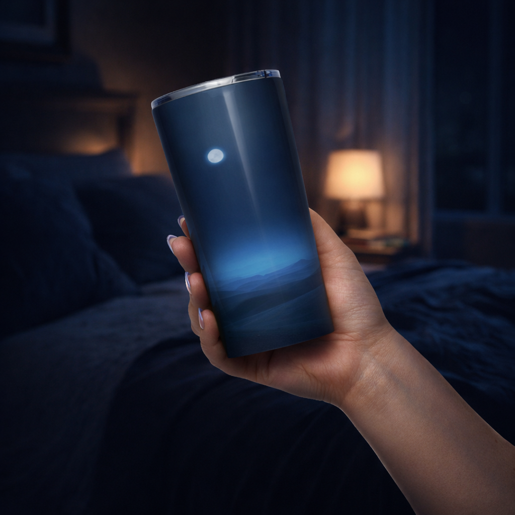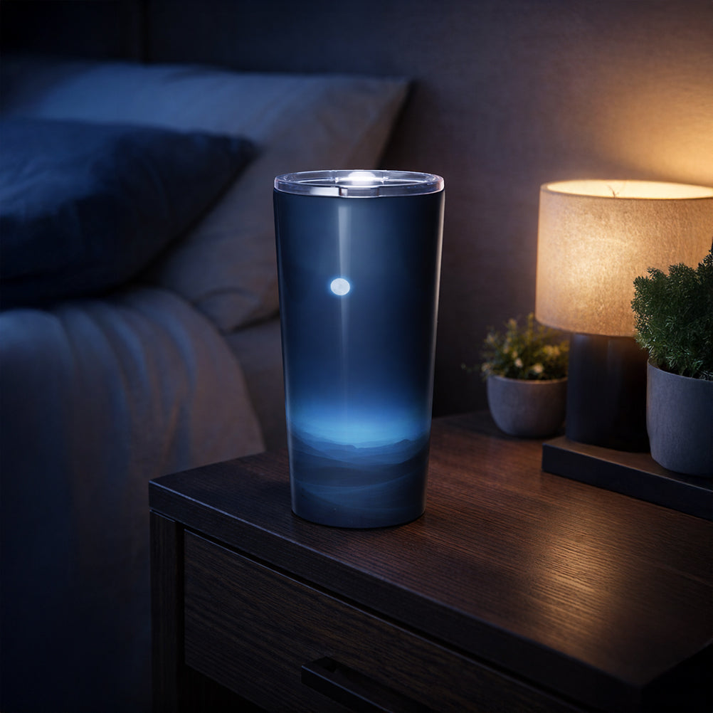 SleepSide Sipper is made for those middle-of-the-night sips when you do not want to sit up, turn on lights, or leave the comfort of your bed. Keep it on your nightstand and you have a sleek, easy-grab tumbler that keeps water icy, tea warm, and your sleep uninterrupted. The double-walled vacuum insulation holds temperature for hours, so your drink stays exactly how you want it from lights-out to morning. No sweaty exterior, no cold condensation rings, just a clean, comfortable bedside experience. The tapered stainless steel body is designed to feel secure in one hand, even when you are half asleep. The spill-resistant transparent press-in lid helps protect against accidental bumps from blankets, elbows, pets, or a crowded nightstand. And with wraparound print potential and a glossy finish, it looks as good as it performs, perfect for custom designs that make your bedside setup feel intentional and elevated. When the night is done, it is dishwasher-safe, so it is ready to go again tomorrow.
